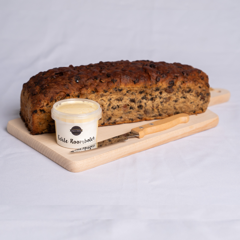 Krentenwegge met plank, room boter en mes