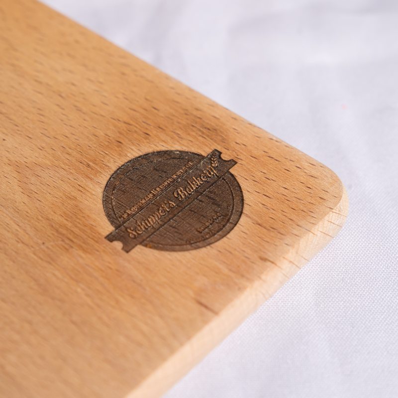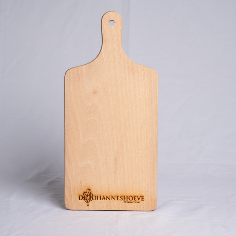Houtensnijplank met handvat en graveerwerk van +- 25cm2.